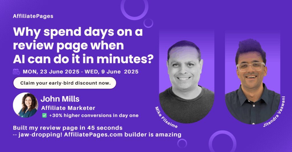 AffiliatePages by Jitendra Vaswani has tools that create content that’s helpful for both humans and bots. Thus, it uses Artificial Intelligence and Machine Learning to help people create engaging and persuasive content for affiliate, review, or SaaS websites.
