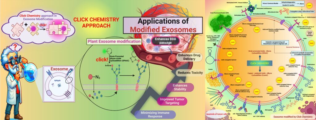 Enter click chemistry, a set of chemical reactions that allows for highly selective and efficient modifications to biological molecules. This approach provides a way to chemically attach molecules, such as drugs or antibodies, to exosomes with remarkable precision and stability. The two primary reactions used are copper(I)-catalyzed azide-alkyne cycloaddition (CuAAC) and strain-promoted azide-alkyne cycloaddition (SPAAC), both of which enable the secure attachment of therapeutic molecules to exosomes without disrupting their natural functions. By utilizing click chemistry, researchers can engineer exosomes to be more effective drug delivery vehicles. This process involves attaching targeting ligands—such as antibodies or peptides—to the surface of exosomes, allowing them to home in on specific cancer cells, ensuring that the therapeutic agents are delivered directly to the tumor. This targeted approach minimizes the damage to healthy tissue, which is a common side effect of conventional cancer treatments. Moreover, exosomes modified with imaging agents can be tracked in real-time, allowing doctors to monitor the distribution and effectiveness of treatments. This combination of targeted delivery and diagnostic capabilities is called theranostics and holds great promise for improving cancer treatment, discussed in their newly published paper at Chemical Engineering Journal-Elsevier.