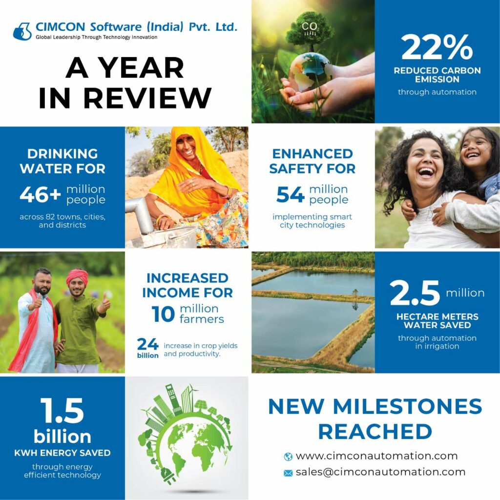India, May 14th, 2024 – CIMCON Software (India) Pvt. Ltd., a pioneering AI-driven technology company specializing in smart infrastructure solutions, announces its exceptional performance for financial year ending March 31, 2024. The company achieved a remarkable doubling of its revenue compared to the previous year, enabled the distribution of water in over 3,000 villages, saved an impressive 2 billion kW of energy, and enhanced safety for 54 million citizens nationwide. With India making a big push towards digital, CIMCON is delighted to accelerate that mission by deploying its solutions at scale across various infrastructure projects in India.
