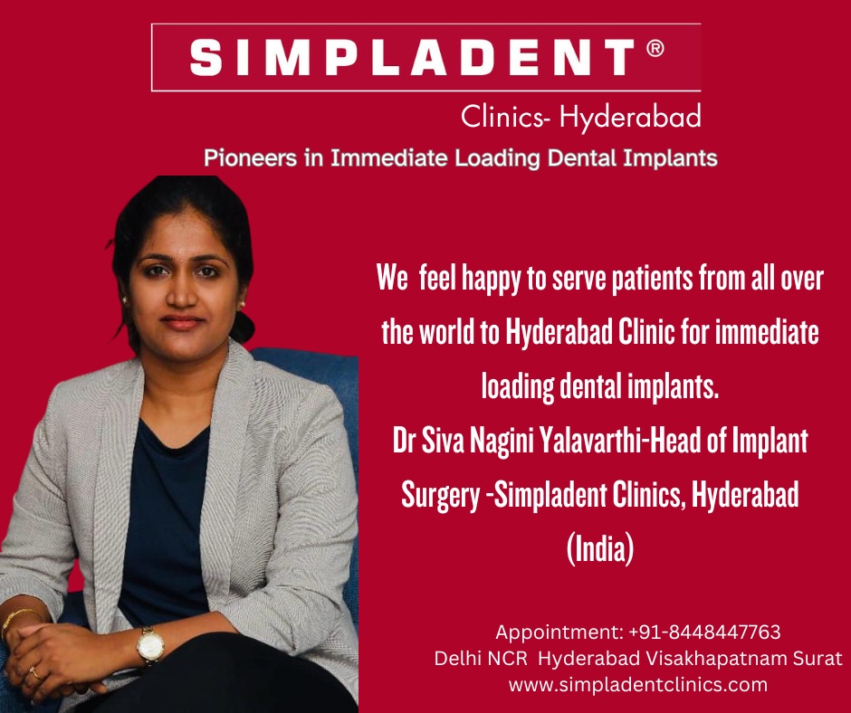 About Simpladent Hyderabad: Simpladent Hyderabad is a leading dental clinic in Hyderabad, India, specializing in immediate loading dental implants and other comprehensive dental solutions. Under the expert care of Dr. Siva Nagini Yalavarthi, the clinic is committed to delivering exceptional results with a focus on efficiency, quality, and patient satisfaction. With a dedication to innovation and excellence, Simpladent Hyderabad is transforming smiles and lives with its revolutionary approach to dental care. Branches also at Delhi NCR, Surat, Visakhapatnam, Simpladent invites patients from all over the world. For appointment call +91-8448447763 or visit www.simpladentclinics.com