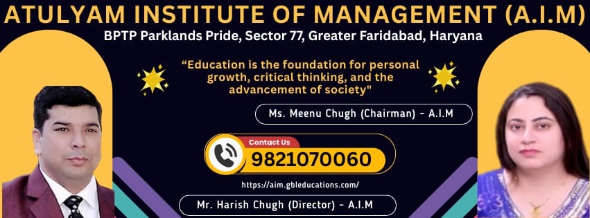 A.I.M is chaired by Ms. Meenu Chugh: She believes education as a journey of awakening potential. Her mission is to go beyond academic achievement. She wants to cultivate integrity, curiosity, ethical leadership and a sense of social responsibility among every student who passes from A.I.M (Atulyam Institute of Management).