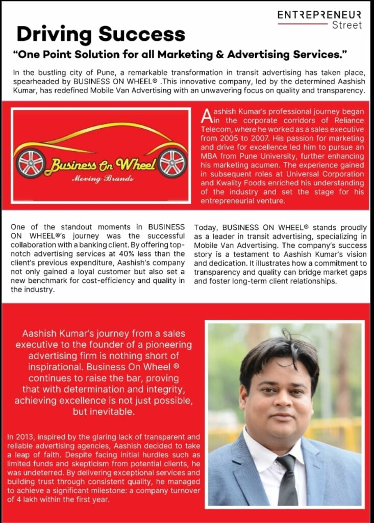And it’s not just industry buzz. Business On Wheel® has been recognized as the Best Advertising Agency in Pune (2023) and featured in EntrepreneursStreet Magazine, Mid-Day, and Business Standard for its relentless drive to redefine outdoor advertising in India.