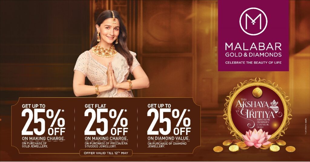 Customers can get up to 25% off on making charges for gold jewellery, a flat 25% off on making charges on the purchase of Precia/Era studded jewellery, and up to 25% off on the diamond value on the purchase of diamond jewellery. These enticing offers are valid from April 27th to May 12th.