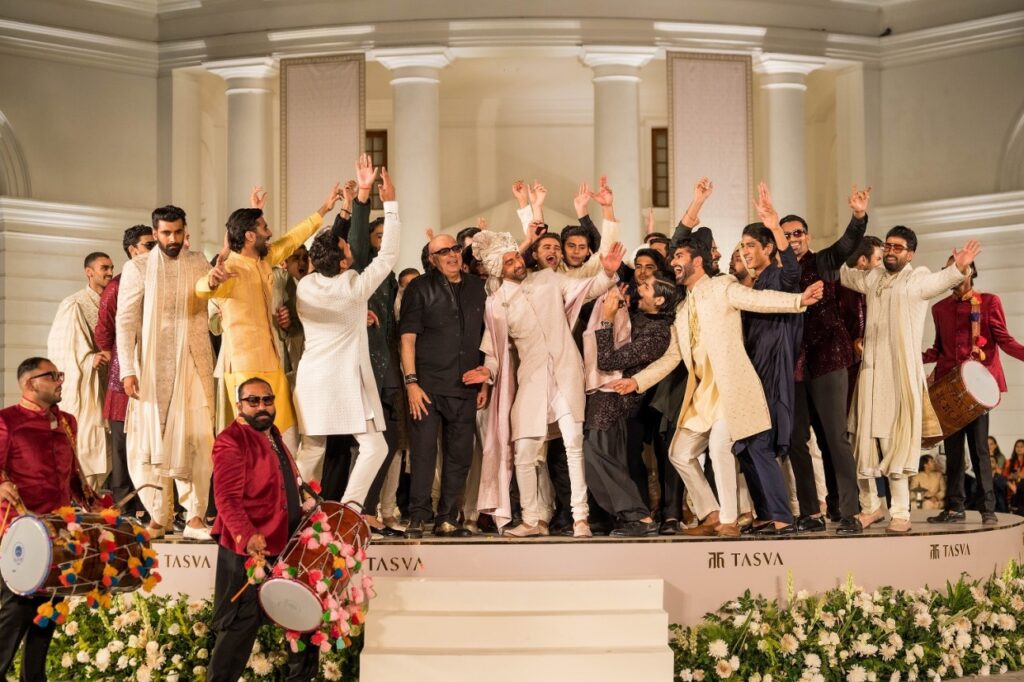 The ‘BAARAAT’ by Tasva, was inspired by the lively and vibrant Indian wedding procession, reimagined as a fashion showcase that spotlighted the groom. The baaraat, traditionally symbolizing the groom’s joyous arrival, was presented in this unconventional and visually stunning fashion show.